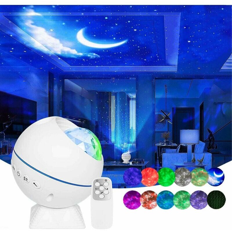 Proiezione del cielo stellato - Il proiettore del cielo stellato include animazioni a LED come nuvole di nebbia, luce colorata, luna, stelle e oceano vivente. La proiezione della luce può anche essere rappresentata o combinata con altri motivi. La luminosità può essere regolata in base alle tue esigenze. 【Velocità regolabile dell'animazione delle nuvole】 L'impostazione predefinita è statica. Premere una volta per 50% - 100% - 50% - statico. Viene eseguito un ciclo alla volta. Questo prodotto si spegnerà automaticamente dopo 4 ore di utilizzo. 【Telecomando】 Usa il prodotto comodamente dal divano o dal letto. Oltre all'accensione/spegnimento, il telecomando consente anche di controllare la luce colorata e le modalità di illuminazione (75% - 50% - 30% - 50% - 75% - 100%). 【Controllo acustico】 Con il controllo acustico selezionato, lo Starry Sky Projector risponde al rumore esterno o alla musica lampeggiando al ritmo del LED. 【【Ottimo per i bambini】 La lampada di proiezione del cielo