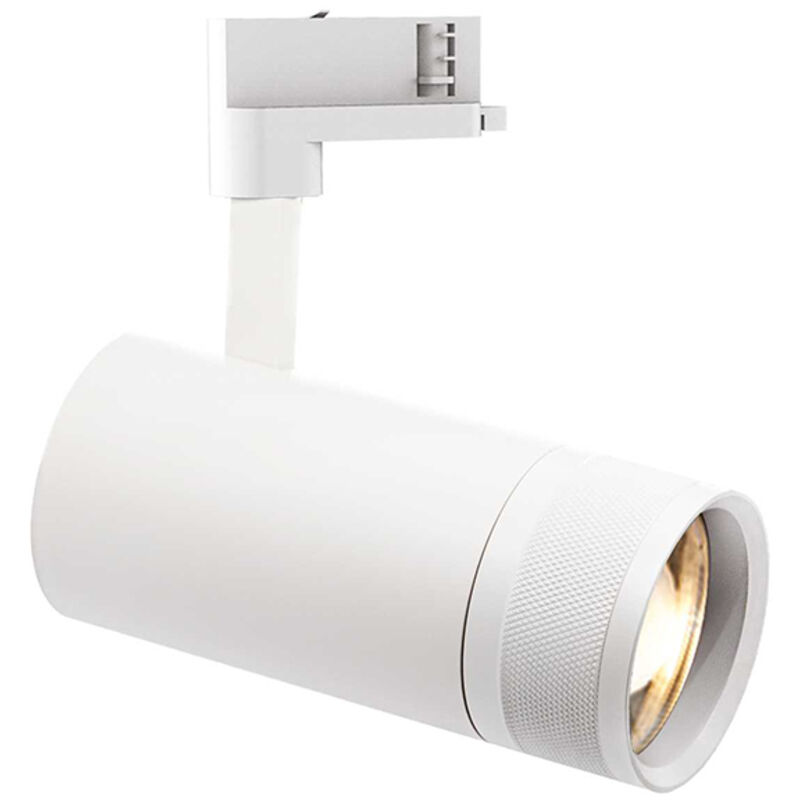 Proiettore cilindrico in alluminio estruso con ottica simmetrica e fascio di apertura variabile da stretto ad ampio (20°-55°),adatto per installazione su binario trifase.Verniciatura a polveri, testata girevole 355° e orientabile fino a 90°;