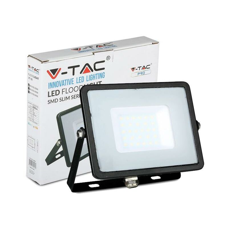 30W LED proiettore SMD SAMSUNG CHIP Corpo Nero Luce Bianco Freddo SKU: 402: VT: VT-30 Caratteristiche del prodotto Bianco freddo, naturale e caldo Disponibile da 30W fino a 300W Migliore Qualità del corpo in lega di alluminio Resistente alla corrosione Maggiore impermeabilità/ermeticità dellinvolucro in vetro, sigillato con gomma siliconica Migliore Qualità dei componenti LED Samsung Integrato di Driver a corrente costante Integrato di Alimentazione, non necessario trasformatore esterno Installazione Passi carrai Giardini Cartelloni Campi sportivi Parcheggi etc. Specifiche tecniche Informazione generale Tipo LED SAMSUNG Chip Vita media 30 000 h Dati elettrici Potenza 30W Tensione AC: 220-240V Frequenza 50Hz Fattore di potenza >0.9 Dati tecnici Luce Colore della luce Bianco Temperatura di colore 6400K Flusso luminoso 2400 lm Indice di resa cromatica Ra >80 Fascio Luminoso 100 ° Dettagli corpo Materiale Alluminio Colore Nero Funzionalità Dimmerabile No IP Protezione IP65 Tempo innesco