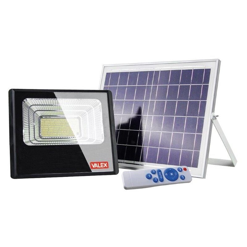 Proiettore solare all. 40w con pannello grado di protezione ip65 - lunghezza cavo 5m - pannello solare 6v/12w, dimensioni 350x290x17mm - dimensioni proiettore 230x195x50mm - luce naturale 4000°k - sensore crepuscolare - controllo da remoto con telecomando - autonomia 8h.