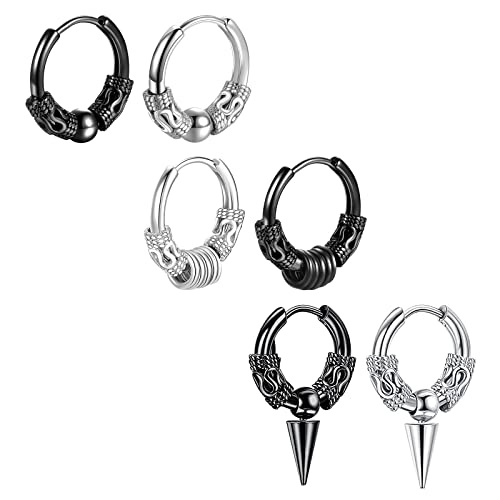 PROJEWE 3 Paia di Orecchini da Uomo Cerchio Orecchini Huggie Vintage Set Orecchini Hip Hop in Acciaio Inossidabile Orecchini Punk Rock Orecchini Cerchio Orecchini Huggie Hoop, Nero, Argento