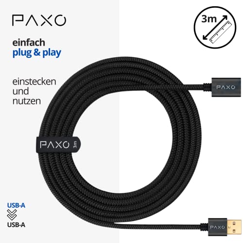 PAXO Prolunga 3m Nylon USB 2.0 nera, cavo di prolunga A-A, spina in alluminio, guaina in tessuto