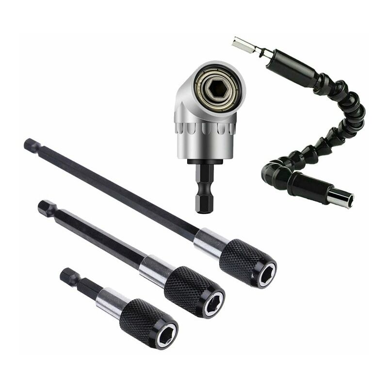 1. Adattatore per trapano ad angolo retto: gli ingranaggi sono montati in pressofusione con 3 cuscinetti a sfera durevoli. La presa magnetica incorporata per impieghi gravosi collega punte esagonali standard e punte di guida per evitare che cadano Design a 105° per spazi ristretti Estende la potenza di un avvitatore a batteria Coppia massima: 10 N/m 2. Prolunga per cacciavite: morbida e flessibile. Può essere attorcigliato, piegato in un punto stretto o arrotolato senza alcuna difficoltà. L'asta flessibile del cacciavite è facile da piegare e portare ovunque. 3. Punte per avvitatore a impatto: realizzate in acciaio al cromo vanadio, acciaio S2 e processo trattato termicamente, la punta di prolunga è compatta e resistente. Il collare magnetico blu può essere ruotato per regolare la profondità della presa per avere una connessione solida. Con un magnete integrato, il mandrino può contenere saldamente qualsiasi bit Il portainserti da 10,6 cm si adatta agli strumenti comuni: l'albero di