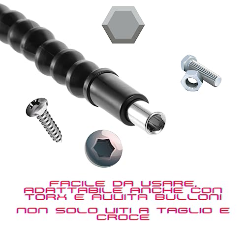 Flessibilità e versatilità : La prolunga offre una straordinaria flessibilità e versatilità, adattandosi a una varietà di esigenze di avvitatura. Può essere piegata in diverse direzioni e configurazioni per consentire un posizionamento preciso e agevolare il lavoro in spazi angusti o difficili da raggiungere.