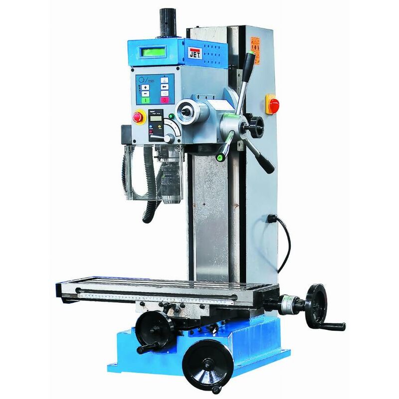 Dettagli: motore brushless / riduttore meccanico Display digitale / controllo elettronico della velocità Funzionamento a sinistra/destra con funzione di maschiatura M12 Regolazione precisa del mandrino con indicazione digitale della profondità Testa inclinabile 90°D e 45°G Abbassamento micrometrico del mandrino Estrattore inferiore M12 / protezione del servo mandrino Base: 5000046-G (opzione) Caratteristiche: Dati tecnici Tensione del motore 230 volt Potenza motore 1,0 kW Attacco conico MK/CM 3 Capacità acciaio Ø 20 mm Corsa del mandrino 70 mm Velocità variabile 100-1750 min-¹ Asse X, corsa longitudinale 350 mm Asse Y, corsa trasversale 150 mm Larghezza della scanalatura a T 12 mm Peso 165 kg