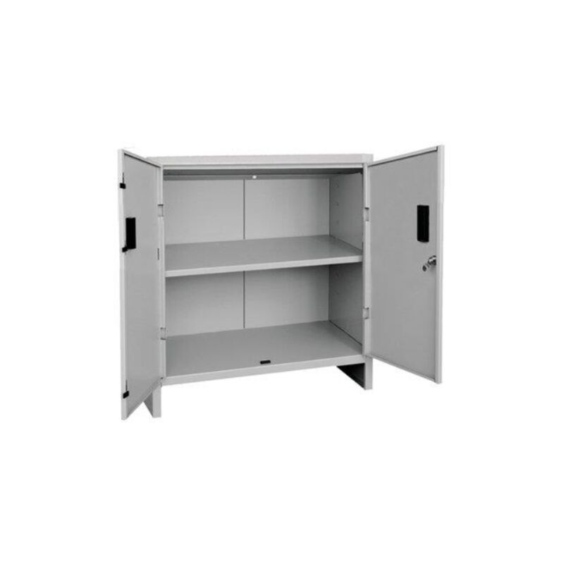 In lamiera di acciaio pressopiegata, con pretrattamento di fosfosgrassaggio e verniciatura a forno continuo. Colore grigio RAL 7035. Con doppia anta e serratura. Da assemblare.