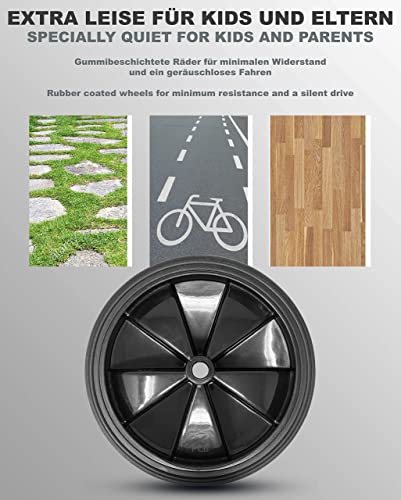 Estremamente silenzioso per bambini e genitori: ruote rivestite in gomma sugli stabilizzatori, per una resistenza minima e una guida silenziosa.