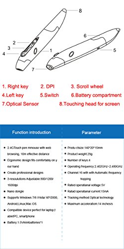 Funzione 1. Capacity Touch Screen per Smart Phone 2. Mouse per Smart TV, Computer. 3. Controllo del lettore PPT