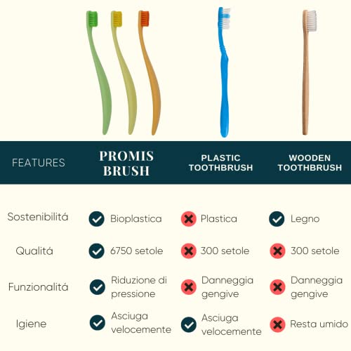 Promis brush trio color | 2 Confezioni a 6 pezzi | spazzolino sostenibile realizzato in materiale rinnovabile | bioplastica | 6750 setole morbide | made in Germany | design italiano