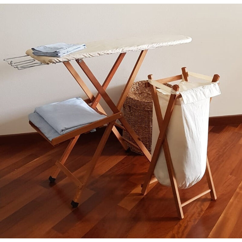 Set composto da Asse da stiro e Portabiancheria richiudibile in legno di faggio massiccio, colore noce. Set composto da Asse da stiro economico in legno di faggio massiccio con piano in legno idrorepellente e Portabiancheria. L'asse da stiro dispone di griglia appoggia ferro cromato e ripiano portabiancheria in legno cm 35x35. Con piedini antiscivolo ad alta resistenza. Finitura: noce Misura del piano stiro: cm 118x34. Dimensioni aperto: cm.133x34x80-90h. Dimensioni chiuso: cm. 117x34x7. Altezza regolabile in tre posizioni. Il telo e mollettone sono compresi, colori assortiti. Portabiancheria richiudibile in legno di faggio massiccio, finitura noce. Sacca asportabile. Dimensioni aperto: cm. 31x35x75,5h Dimensioni chiuso: cm. 34x5x81h