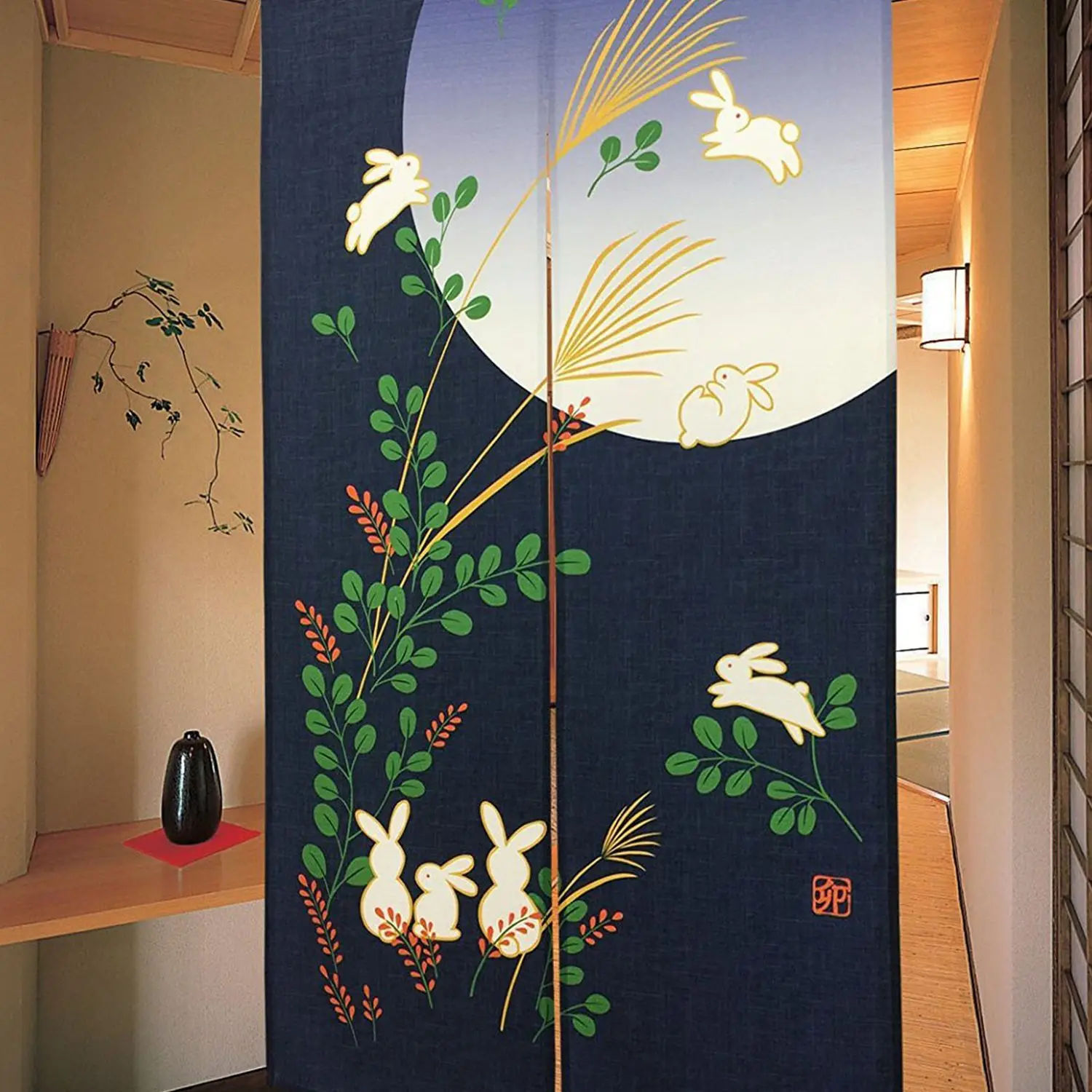 Promotion! Japanese Doorway Curtain Noren Rabbit Under Moon For Home Decoration 85X150Cm
