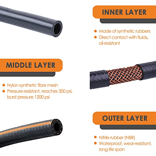 Costruzione a triplo strato: il tubo ha una robusta struttura a tre strati, spessa ma molto resistente. L'interno ed esterno sono realizzati in gomma nitrilica (NBR) per resistenza al calore e resistenza all'olio, garantendo una lunga durata. Lo strato intermedio ha una rete in fibra sintetica resistente alla pressione che raggiunge i 300 psi a 1200 psi.