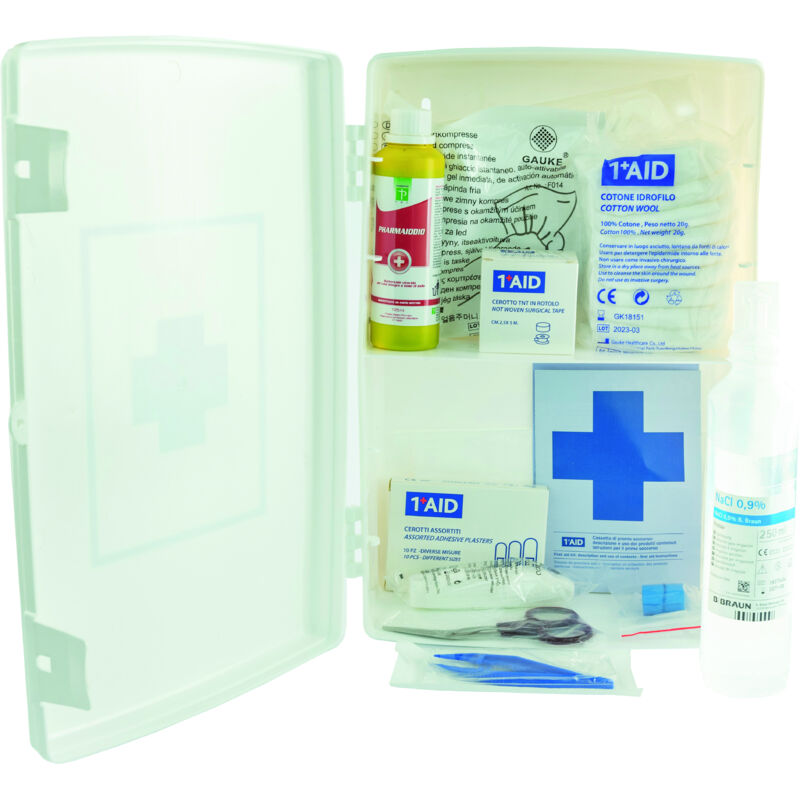Armadietto in plastica 24.5x13xH35 cm. Dotato di 1 ripiano e fori posteriori per l'attacco a parete. Contenuto 16 referenze per prime operazioni di soccorso. Per aziende del gruppo C con meno di tre lavoratori. Per il contenuto consultare la scheda tecnica