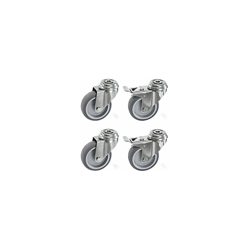Set di ruote in gomma termoplastica, supporto in acciaio inox, con foro complementare, 4 rotelle pivottanti di cui 2 con fermo doppio, Ø x larghezza ruote 50 x 19 mm. Fornitura = montato. Diametro ruote = 50 mm. Forma = rotella pivottante, rotella pivottante con fermo doppio. Fornitura = 4 rotelle pivottanti di cui 2 con fermo doppio. Materiale ruote = gomma - elastomeri in gomma termoplastica (TPE). Materiale cerchioni = polipropilene. Materiale corpo = acciaio inox. Portata a 4 km/h = 50 kg. Tipo di fissaggio = con foro complementare. Larghezza ruote = 19 mm. Altezza d'ingombro = 68 mm. Cuscinetti ruota = cuscinetto a strisciamento. Resistenza alle temperature = da -10 °C fino a +70 °C. Sporgenza rotelle pivottanti = 24 mm. Diametro foro complementare = 10.5 mm. Diametro piastra = 40 mm. Superficie del corpo = acciaio inox. Ridotta resistenza al rotolamento, scorrimento agevole. Profili lisci, resistenti all'abrasione. Resistenti a temperature da -10 °C a +70 °C. Durezza 85 ±3 Shore