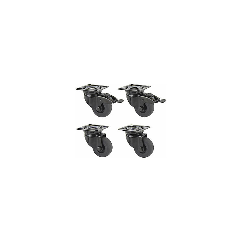 Ruote in gomma termoplastica nera, con piastra di montaggio, offerta set, 2 rotelle pivottanti con fermo doppio e 2 rotelle pivottanti, Ø x larghezza ruote 50 x 19 mm. Fornitura = montato. Diametro ruote = 50 mm. Forma = rotella pivottante, rotella pivottante con fermo doppio. Fornitura = 4 rotelle pivottanti di cui 2 con fermo doppio. Materiale ruote = gomma - elastomeri in gomma termoplastica (TPE). Materiale cerchioni = polipropilene. Materiale corpo = acciaio. Portata a 4 km/h = 40 kg. Tipo di fissaggio = con piastra di fissaggio. Larghezza ruote = 19 mm. Altezza d'ingombro = 70 mm. Cuscinetti ruota = cuscinetto a strisciamento. Resistenza alle temperature = da -20 °C fino a +60 °C. Sporgenza rotelle pivottanti = 25 mm. Diametro fori filettati = 6 mm. Dimensioni piastra rotella pivottante = 60x60 mm. Interasse fori filettati = 38x38 - 46x46 mm. Superficie del corpo = verniciatura a polvere. Profili lisci, resistenti all'abrasione. Ridotta resistenza al rotolamento, scorrimento