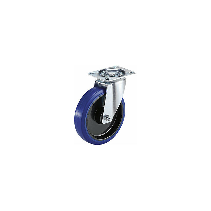 Ruote in gomma elastica con cerchioni in plastica, Ø x larghezza ruota 125 x 36 mm, rotella pivottante. Fornitura = montato. Diametro ruote = 125 mm. Forma = rotella pivottante. Materiale ruote = gomma - gomma piena - completamente elastico. Materiale cerchioni = plastica. Materiale corpo = acciaio. Portata a 4 km/h = 150 kg. Tipo di fissaggio = con piastra di fissaggio. Larghezza ruote = 36 mm. Altezza d'ingombro = 155 mm. Cuscinetti ruota = cuscinetto a rulli. Resistenza alle temperature = da -5 °C fino a +60 °C. Sporgenza rotelle pivottanti = 36 mm. Diametro fori filettati = 9 mm. Lunghezza mozzo = 49 mm. Foro mozzo = 15 mm. Dimensioni piastra rotella a supporto fisso mm = 105x85 mm. Dimensioni piastra rotella pivottante = 105x85 mm. Interasse fori filettati = 80x60 mm. Superficie del corpo = zincatura. Su cerchione in plastica. Adatte per fondi sconnessi e accidentati. Elevata resistenza all'usura. Durezza 70 Shore A. Resistenti a temperature da -5 °C a +60 °C. Cuscinetti di