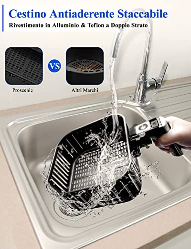 CESTINO ANTIADERENTE & LAVABILE IN LAVASTOVIGLIE: La friggitrice ad aria è in possesso di un pratico cestello, rimovibile in modo semplice dalla friggitrice e che può essere lavato direttamente in lavastoviglie grazie al rivestimento in teflon antiaderente. Tutti, con questo strumento in mano, possono diventare dei veri e propri chef.