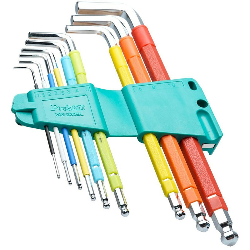 Set di 9 chiavi a brugola colorate extra lunghe con magnetizzatore Set di 9 chiavi esagonali ad alta coppia. Design a sfera su un'estremità. Magnetizzatore incorporato. Realizzate in acciaio S2 e rifinite in cromo lucido per resistere alla corrosione. Design con codice colore per una presa comoda e una facile identificazione. Il magnetizzatore incorporato rende le chiavi facilmente magnetiche. Il braccio lungo e l'estremità sferica consentono di accedere a punti difficili da raggiungere con un'angolazione fino a 25°. La custodia in gomma per appenderla consente di riporla facilmente. Contiene 9 chiavi esagonali Acciaio S2 con cromatura a specchio Magnetizzatore incorporato nel supporto Pitch 1.5, 2.0, 2.5, 3.0, 4.0, 5.0, 6.0, 8.0 e 10mm