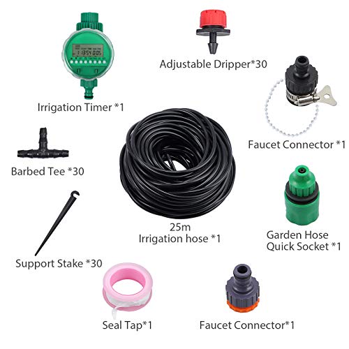 【Sistema di Irrigazione a Goccia】Il Nuovo Kit Micro Irrigazione Fai-Da-Te Include: 1 Timer per Irrigazione + 2 Tipi di Connettori + 4 mm 82FT 25m Tubo + 30 Ugelli + 30 Raccordi a Forma di T + 30 Gancio Singolo + 1 Nastro in Teflon. Il Tubo da 25m Configurato Può Essere Tagliato alla Lunghezza Appropriata in Base alla Necessità. Perfetto per Giardini, Patio, Atrio, Balconi, Cesti Sospesi, Serre, Cortili, Vasi da Fiori, Trogoli.