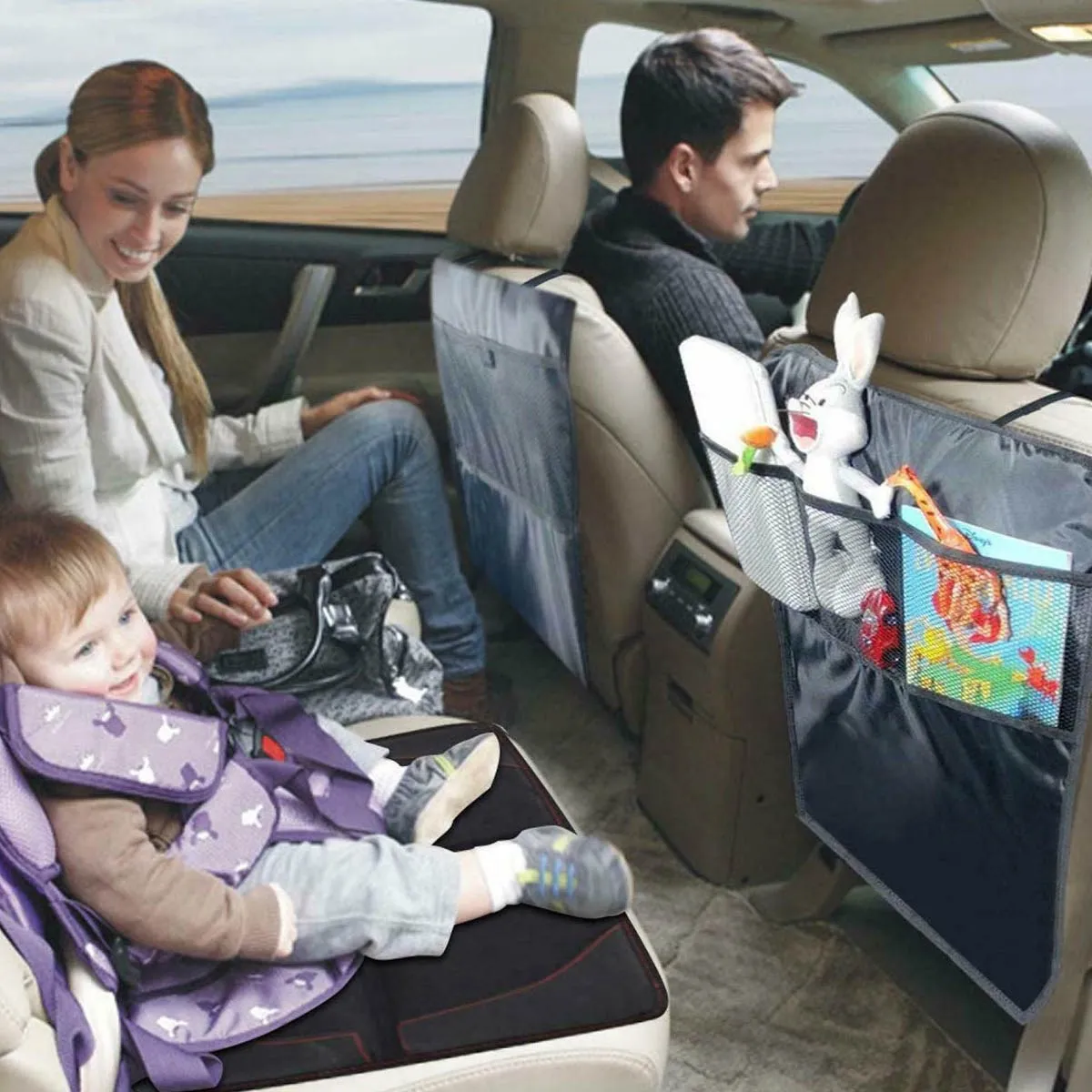 2 Pack Kick Mat Auto Seat Back Protectors + 3 Organizer Pockets, Heavy Duty Sag Proof, Kick Guard Seat Saver Back Protector