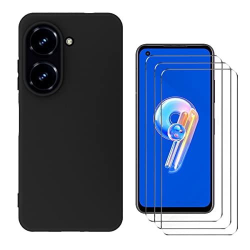 QFSM Protettiva Cover + 3* Vetro Temperato per ASUS Zenfone 9 (5.9"), Silicone TPU Case Morbido Custodia NeroShell e 9H durezza Vetro Temperato Pellicola Vetro Glass - Black