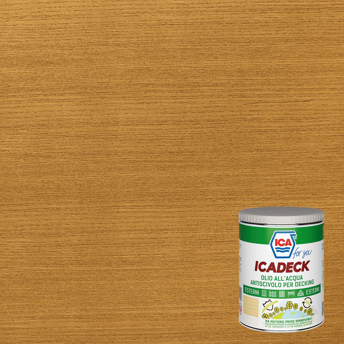 ICADECK OLIO ALL'ACQUA BIO ANTISCIVOLO PER DECKING. A basso impatto ambientale con materie prime da fonti rinnovabili. Facile da applicare a pennello o a rullo, protegge il legno dalle intemperie e dai raggi UV, dona ottima uniformità di colorazione. Particolarmente indicato per legni esotici (es. Teak e Iroko). Ideale per bordi piscina data l'alta resistenza all'acqua clorata. Contenuto tecnologico innovativo sviluppato dai laboratori ICA sulle specifiche dei più esigenti professionisti del legno.. Adatto alla protezione di decking e pavimenti in legno all'esterno.. Ideale per chi cerca un metodo facile per proteggere decking e pavimenti in legno all'esterno senza dover effettuare difficili lavori di manutenzione e ripristino.. Protezione professionale del legno all'esterno alla portata di tutti. Derivato da prodotti testati a lungo da utilizzatori professionali nelle condizioni atmosferiche più estreme.. Contribuisce alla riduzione di