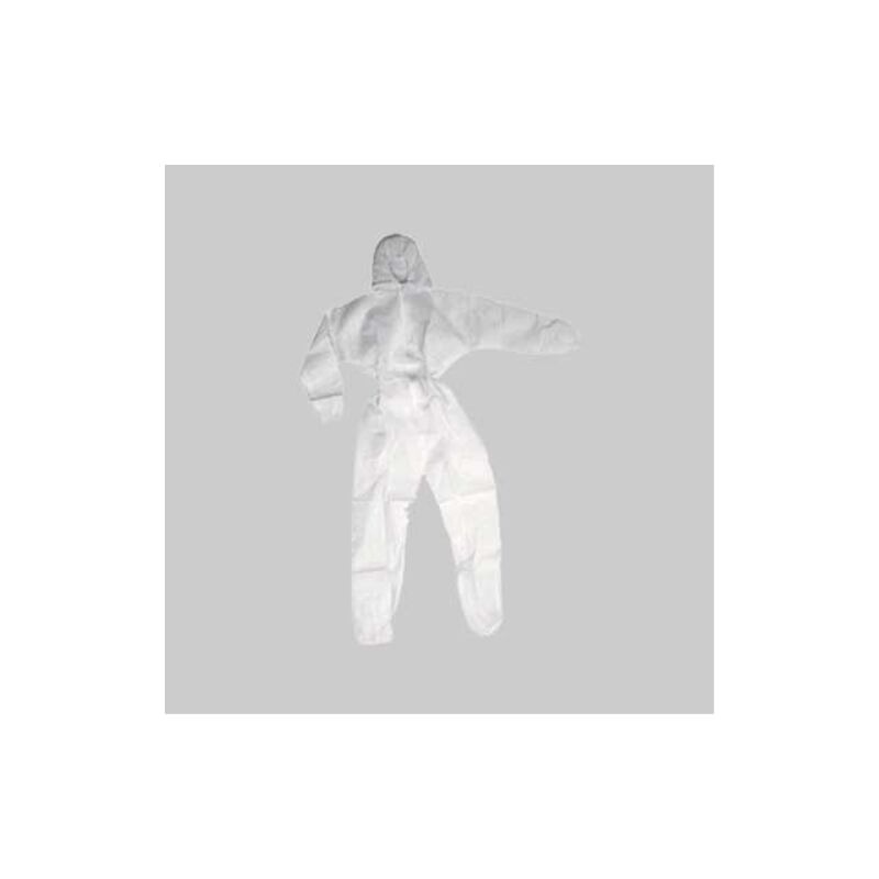 Tessuto non tessuto TNT 100% polipropilene, 30 g/mý. Con cappuccio, chiusura con cerniera. Elastico alle caviglie, ai polsi, in vita e nel cappuccio. Colore bianco. Tuta di protezione leggera tg. l Tute di protezione
