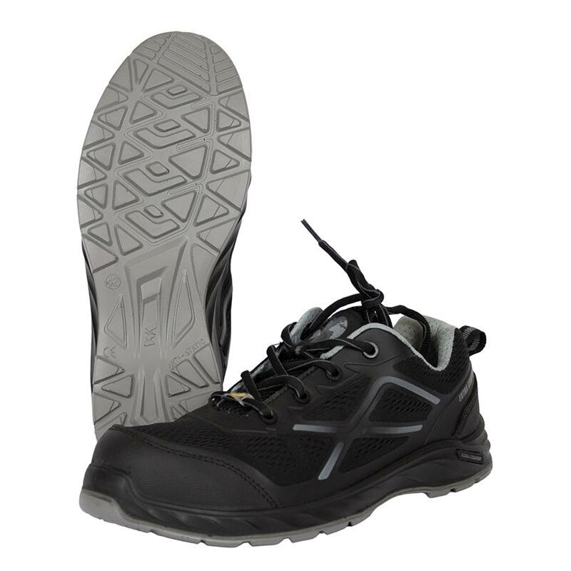 Calzatura bassa con puntale in composito e soletta tessile antiforo. Tomaia in similpelle e retina traspirante. Suola in PU/PU ETPU antistatica, antiscivolo, antiacido, antiolio. Resistenza ESD.