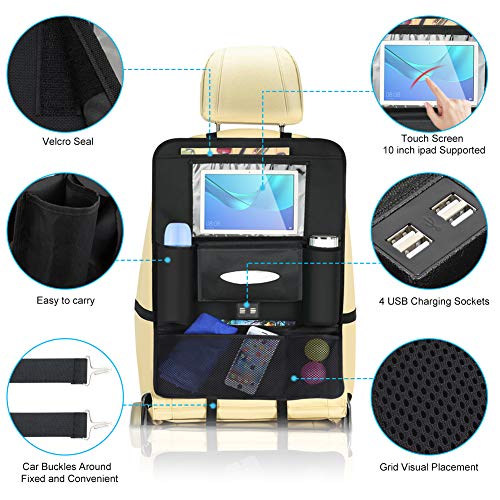 Protezione Sedile Auto Upgraded Version,Impermeabile Protezione Sedile Posteriore,Caricabatterie 4USB,Scomparto Grande per iPad/Tablet,Organizer per Auto per Bambini con Scatola del Tessuto Inclusa