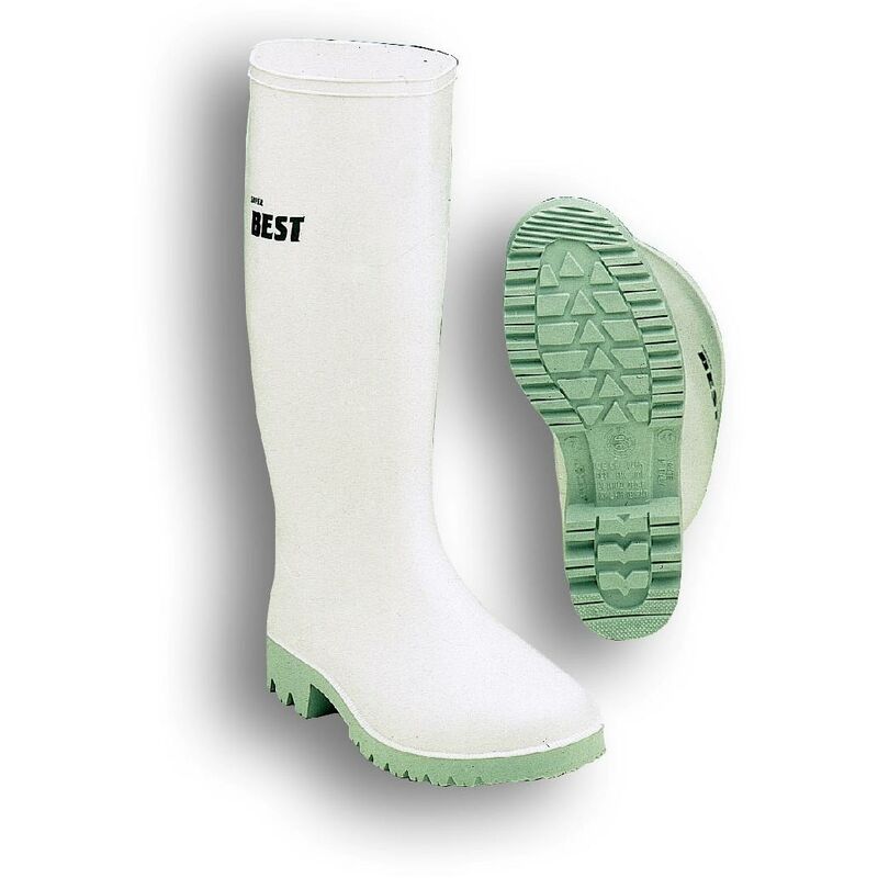 Stivale al ginocchio in gomma nitrilica bianca, senza puntale. Suola grigia antiscivolo resistente ai grassi animali, olii e acidi, antistatica
