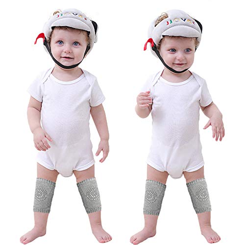 Protezione per testa regolabile per elmetto sicurezza per neonati, con ginocchiere per gattonare Protezione per ginocchio antiscivolo per bambino - Set di protezioni per camminata antiscivolo, grigio