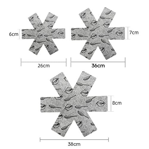 3 diverse dimensioni: include 6 cuscinetti protettivi. 3 diverse dimensioni (38 cm/36 cm/26 cm) 3 per ogni dimensione, è possibile tagliare le dimensioni in base alle proprie esigenze. I rivestimenti in feltro possono essere facilmente tagliati sulle vostre padelle.