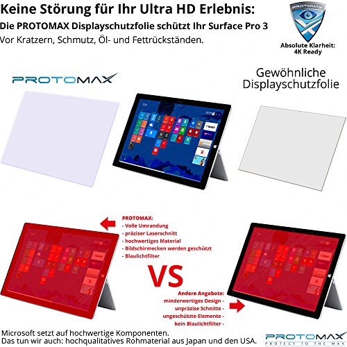 3 X pellicola protettiva Microsoft Surface Pro 3: luce blu pellicola protettiva con filtro Proto max proeye tecnologia - La protezione display trasparente ideale appositamente per il tablet Microsoft Surface Book. Adatto anche come pellicola protettiva per monitor laptop o computer portatile. Proto max si applica come produttore leader di protettive con generazione con rivoluzionari filtro anti luce blu per sostegno attivo del biorhythmus, piacevole riposo notturno e protezione degli occhi.