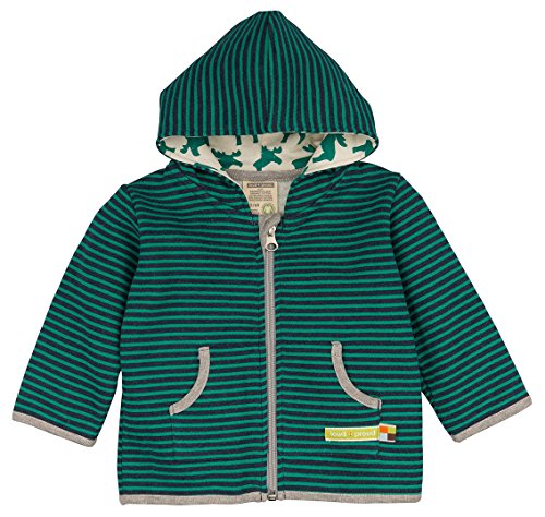 Felpa a righe con cappuccio, esterno lucidato, interno ruvido. Il cappuccio è foderato all'interno con jersey stampato. Cerniera frontale a contrasto e copertura sul foro per il collo. Tasca a marsupio con bordini a contrasto sull'impugnatura. Etichetta con logo e bandierina sulla borsa. Made in Portogallo. 100% cotone (kbA), certificato GOTS.