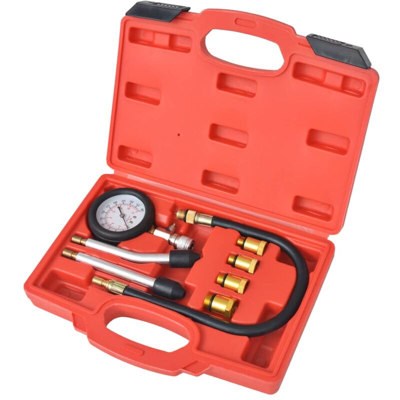 Questo kit di prova compressione per motori è progettato per verificare la presenza di eventuali guasti interni al motore, come valvole difettose, fasce elastiche del pistone o guarnizioni della testa usurate o un eccessivo accumulo di residui di carbonio. Questo kit viene fornito con 1 tubo in gomma e 4 resistenti adattatori per candele d'accensione di diverse dimensioni che permettono di adeguarsi a vari modelli di veicoli. I connettori a tubo dritto e angolato sono dotati di un cono in gomma che non ha bisogno di essere filettato e può essere utilizzato per testare la compressione di quasi tutti i motori. Il manometro, di facile lettura, possiede una doppia scala di misurazione che va da 0 a 300 psi e da 0 a 21 kg/cm². La consegna include 1 tester di compressione, 1 tubo di gomma, 4 adattatori per candele d'accensione, 1 tubo a pressione dritto e 1 tubo a pressione angolato. Tutti i pezzi sono ordinatamente organizzati in una custodia di plastica soffiata. Materiale: Gomma