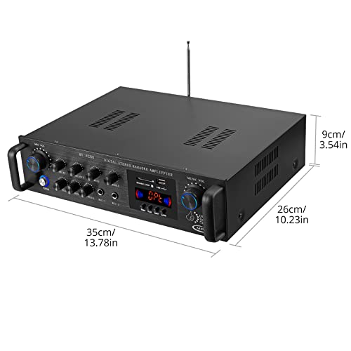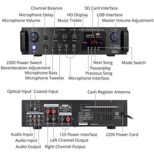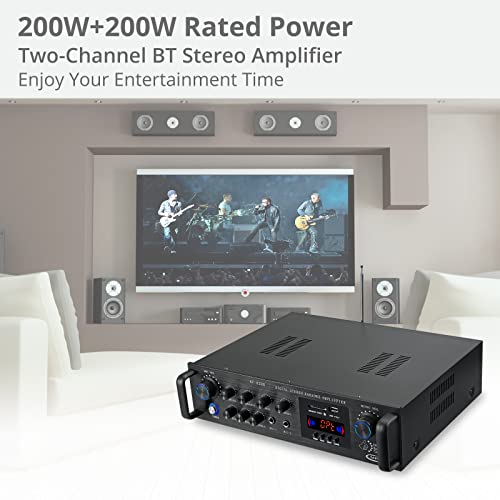 【Ricevitore Amplificatore Stereo di Potenza】 Potenza Nominale 200 W + 200 W, il Ricevitore Amplificatore Stereo a Doppio Canale è Adatto per il Tuo Karaoke, Home Theater, Sistema Audio. Fornisci una Potenza Sufficiente, Ospitando 2 set di Altoparlanti in Modo che tu Possa Goderti gli Effetti Sonori Offerti dall'amplificazione Audio di Alta Qualità.