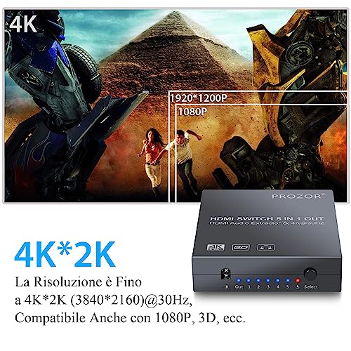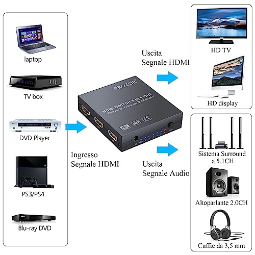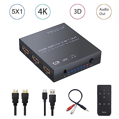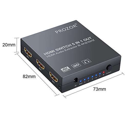 PROZOR 5x1 HDMI Switch con Estrattore Audio HDMI Switcher HDMI Convertitore Audio Include IR Telecomando 1M Cavo HDMI e Cavo Audio Stereo 3.5mm Maschio a 2 RCA Femmina Supporta 4K 3D