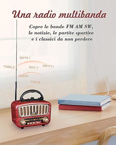 PRUNUS J-180 Radio Portatile Vintage FM/AM/SW, Radio Bluetooth Portatile, Con supporto per telefono cellulare, Batteria Ricaricabile da 1800 mAh Potenziata, Supports TF Card/AUX/USB.