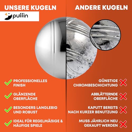Prodotto di qualità. A differenza della concorrenza, le nostre sfere di metallo non hanno uno strato cromato che si rompe, ma una superficie cromata dura. Così sarete particolarmente robusti e durevoli e vi porteranno diversi anni di gioco, divertimento e gioia