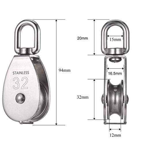 Design: Puleggia singola M32 con rotella liscia, rotazione di 360 gradi per evitare che la corda / cavo / filo si annodino per un uso conveniente.