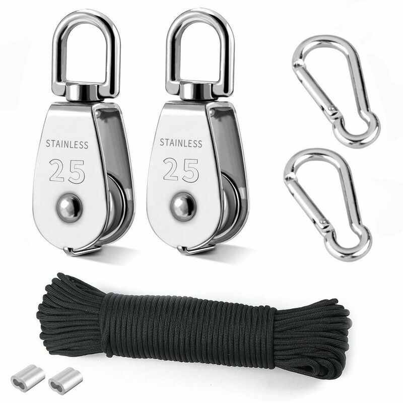 Kit ideale per realizzare un semplice sistema avvolgibile per tende da sole per case mobili. Kit ideale per realizzare un semplice sistema avvolgibile per tende da sole per camper. Utilizzato all'aperto per alzare e abbassare come ascensore per una porta da garage portatile. La carrucola e il moschettone sono ben fatti e molto stabili. Puoi facilmente ospitare un cavo di diametro molto più grande di quello incluso. Funziona bene per appendere una mangiatoia per uccelli. La forza di attrito è maggiore del peso e la ruota gira. Il peso portato dalla puleggia è il cuscinetto, altrimenti la fune e la ruota potrebbero scivolare. Blocco puleggia in acciaio inossidabile 304 con gancio girevole M25 Questo articolo è realizzato in acciaio inossidabile 304 per un uso duraturo. È resistente alla ruggine e alla corrosione con una funzione di scorrimento regolare. È dotato di una grande capacità con un design molto pratico e una struttura molto solida. Il design preciso garantisce la praticità nei