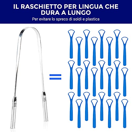 COMBATTE L'ALITO CATTIVO: Il nostro pulisci lingua in metallo è uno dei principali rimedi per l'alito cattivo approvato dai dentisti. Utilizzare il raschietto in acciaio permette di pulire la lingua in maniera più efficace rispetto a un modello in plastica o a uno spazzolino da denti. Questo raschietto pulisci lingua permette di “grattare via” l'ansia e la poca autostima, garantendoti una bocca più fresca e pulita!