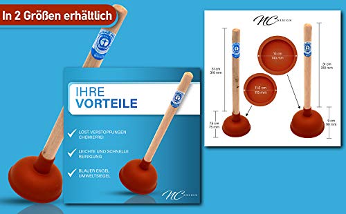 PÜMPEL potente sostegno, allevia i blocchi grazie alla forte potenza di aspirazione, superficie facilmente lavabile, la gomma può essere staccata dallo stelo se necessario per la pulizia, potente pistone in gomma con manico in legno.