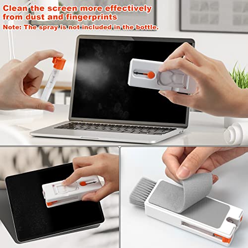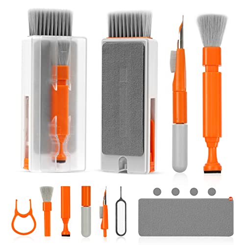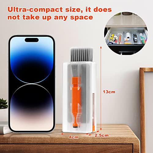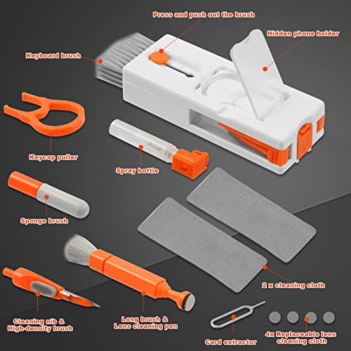 【Kit di pulizia elettronica 11 in 1】Il set di spazzole per la pulizia comprende un dispositivo di rimozione del tappo della chiave, una spazzola retrattile, salviette per la pulizia dello schermo grande, salviette per la pulizia dell'obiettivo piccolo, un supporto per il telefono cellulare, uno strumento per l'espulsione della scheda SIM, una spazzola morbida, una punta di penna in metallo, una spazzola fine ausiliaria, una spugna di velluto, un flacone spray vuoto per la pulizia.