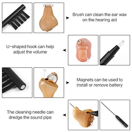 SPAZZOLA MULTIFUNZIONALE: l'aspirapolvere ha un gancio a U su un'estremità per regolare la manopola del volume dell'apparecchio acustico, un magnete sull'altra estremità per rimuovere la batteria e una testina per pulire l'apparecchio acustico. apparecchio acustico.