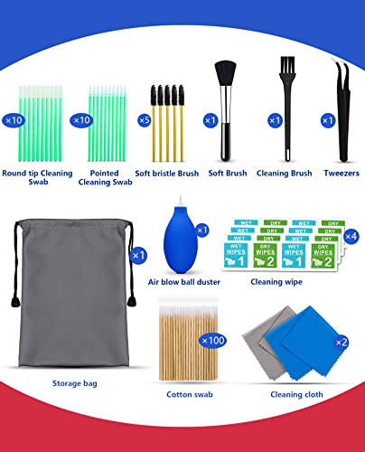 [Ottieni quello che ti serve] Questo kit per la pulizia dello schermo può pulire e rinnovare quasi tutti i dispositivi elettrici. Confezionato 100 tamponi sottili per la pulizia + 20 tamponi per la pulizia + 8 salviette + 5 spazzole morbide + 2 panni in microfibra + 1 spazzola morbida + 1 A. ir Soffiatore + 1 Borse portaoggetti.