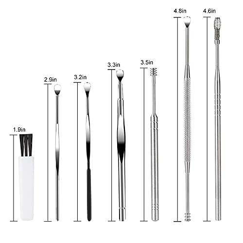 【Stile inossidabile】 ergonomicamente affilato 8 detergenti per curette auricolari di diverse dimensioni per pulire il cerume sia morbido che duro in modo efficiente e confortevole per evitare graffi alle orecchie delicate, non danneggiare il condotto uditivo durante la pulizia efficace. Elevata sicurezza per adulti o bambini.Una piccola spazzola inclusa per pulire gli auricolari dopo l'uso.