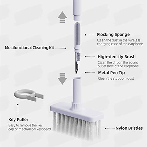 5 in 1 Pulizia Tastiera Spazzola Kit, Penna per Pulizia Auricolari Bluetooth, Strumenti per la Pulizia del Computer con Estrattore di chiavi, Strumento di Pulizia Multifunzionale (Bianco Grigio)
