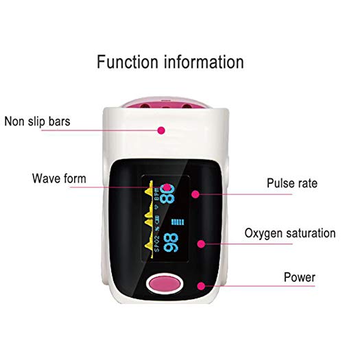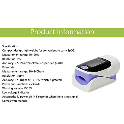 Il display utilizza display a LED o display LCD, di piccole dimensioni, leggero, intuitivo e molto pratico Pulsossimetro:Dimensioni: ca.58 * 37 * 33 mm (L x P x A), tensione di esercizio: 3 V. Consumo energetico: inferiore a 30 mA, si spegne automaticamente quando non c'è segnale nell'ossimetro per più di 8 secondi