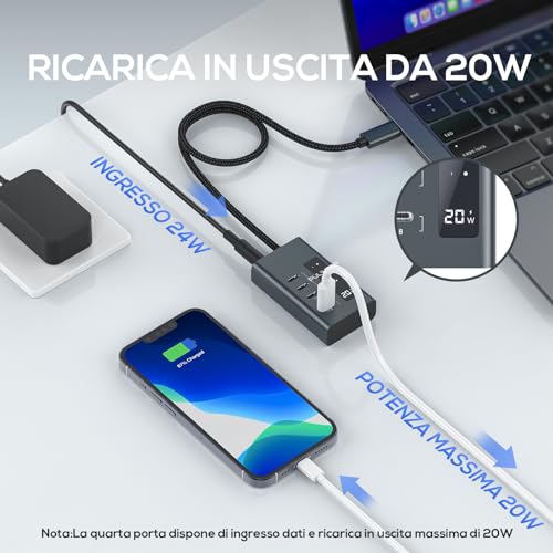 Ricarica Rapida: La quarta porta USB-C dell'hub USB-C è una porta di trasferimento dati e di ricarica 2 in 1 che supporta la ricarica di iPad, iPhone e altri dispositivi (fino a 20 W).
